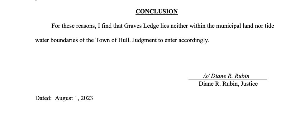 Judge Diane Rubin wrote in her verdict, “I find that Graves Ledge lies neither within the municipal land nor tide water boundaries of the Town of Hull.”